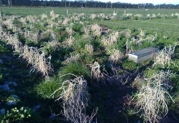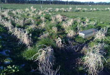 Whether this spring growth is again is checked by late frosts will be interesting to see. Zub and Brancourt-Hulmel’s (2009) research on crop production in Europe suggests frost tolerance is a breed trait that needs to be improved if Mxg is to be produced in colder regions. Their research indicates susceptibility to winter frost at temperatures below −8 °C for rhizomes and −3.5 °C for young shoots of Mxg can lead to significant plant losses and lower yields. Research by Lewandowski et al (2000) also indicates that in the first winter following planting, the rather shallow and under-developed rhizomes can often be damaged or destroyed by cold and or wet conditions. There are no reports of over-wintering problems in the second and subsequent winters. This year’s relatively mild Canterbury winter should prove to be a bonus to this season’s plant growth and well developed shelterbelts should be the outcome from those Mxg plantings in irrigated paddocks. This is providing that the damage caused to the centre pivot at Aylesbury Farm by the recent storm that hit the region on the September 10 (Fig.7) is repaired before water stress levels become too severe. The immediate area surrounding Aylesbury Farm suffered extensive tree damage, something that would not occur with Miscanthus shelterbelts at this time of year as above ground material would have been harvested or senesced. With harvested plots no stock shelter would be available but with senesced plants some shelter protection is still present.