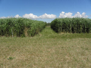 Third growing season Miscanthus (with 1 metre rule). Weeded on right. Unweeded on left.